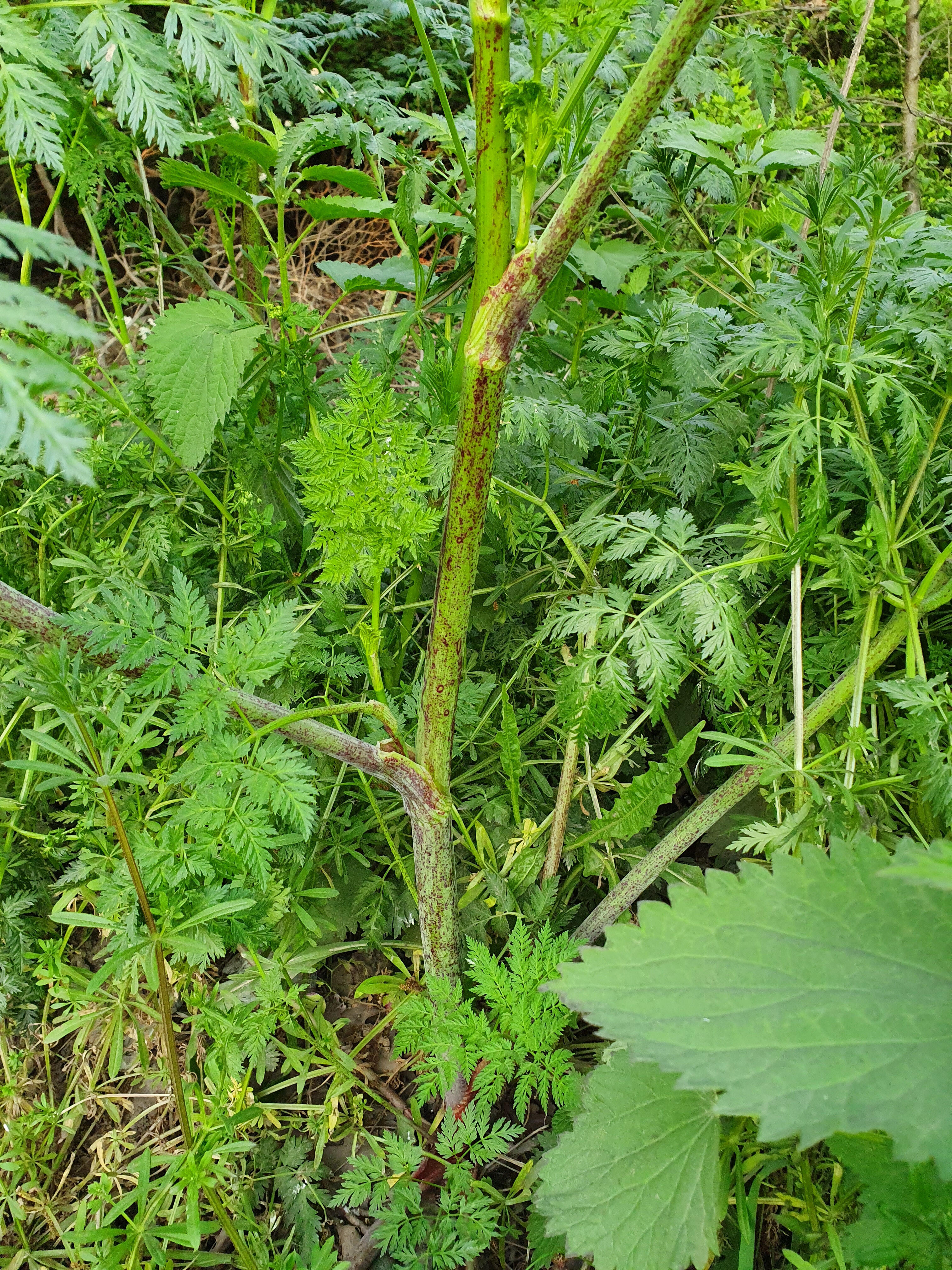 Grows to 1.5 to 2.5 m tall, with a smooth, hairless, green, hollow stem, usually spotted or streaked with red or purple on the lower half of the stem.